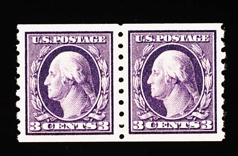 458 nh 394 image#394, 3c Deep violet coil, perf. 8 1/2 vert., a most impressive mint pair, with 3mm spacing, possessing mathematically precise centering amid huge margins on both stamps, fabulously fresh and bright, with sumptuously rich color on immaculate paper, pristine o.g., n.h., extremely fine; very few #394 pairs exist in this true gem quality; 1999 PSE certificate. (Image) 210.00
