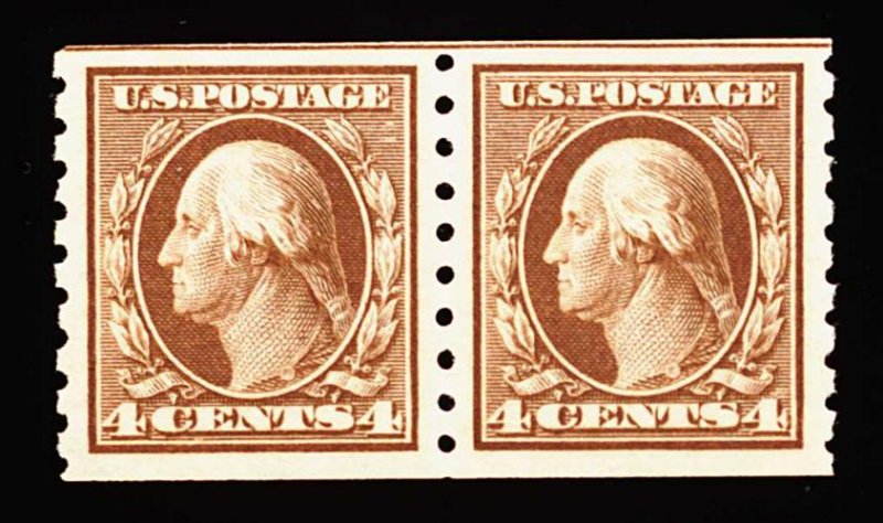 460 nh 395 image#395, 4c Brown coil, perf. 8 1/2 vert., a beautiful quality mint pair, with 3mm spacing, virtually perfectly centered amid margins that are extravagantly large for a perf. 8 1/2 coil, gloriously rich color and impression on bright paper, immaculate o.g., n.h., extremely fine; an especially scarce and desirable pair in such outstanding condition; 1999 PF certificate. (Image) 210.00