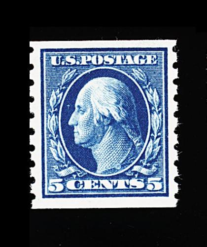 461 nh 396 image#396, 5c Blue coil, perf. 8 1/2 vert., pristine mint single, wonderfully well centered, deep rich color, o.g., n.h., extremely fine; photocopy of a 1995 PF certificate for a pair, this being the right stamp. (Image) 80.00