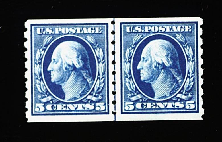 462 nh 396 image#396, 5c Blue coil, perf. 8 1/2 vert., guide line pair, particularly well centered, brilliantly fresh and with deep luxuriant color, o.g., n.h., a very fine and choice example of this scarce line pair; 1991 PF certificate. (Image) 600.00