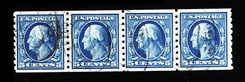 463 O 396 image#396, 5c Blue coil, perf. 8 1/2 vert., used strip of four, well centered, deep rich color, light oval cancels, very fine and undervalued. (Image) 210.00+