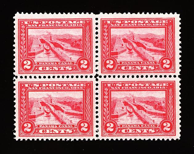 467 nhbl 398 image#398, 2c Panama-Pacific, mint block of four, each stamp very well centered within exceptionally large margins, strong vibrant color, o.g., n.h., extremely fine. (Image) as n.h. singles 140.00+