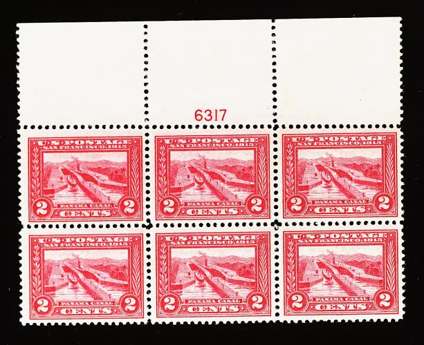 468 nhX 398 image#398, 2c Panama-Pacific, full top margin plate no. 6317 block of six, wonderfully fresh and bright, with intensely rich color, well centered, o.g., n.h., very fine; a particularly choice full top plate block. (Image) 400.00