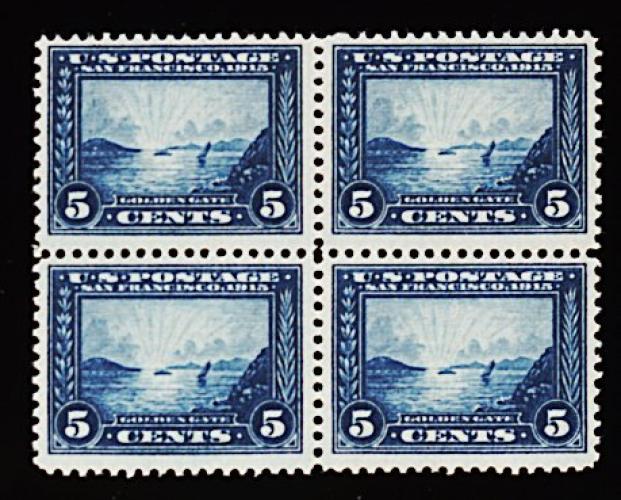 473 nhbl 399 image#399, 5c Panama-Pacific, mint block of four, exceptionally bright and fresh, deep rich color, attractively centered, o.g., n.h., top left stamp with natural perf. dimple, fine-very fine. (Image) as n.h. singles 500.00+