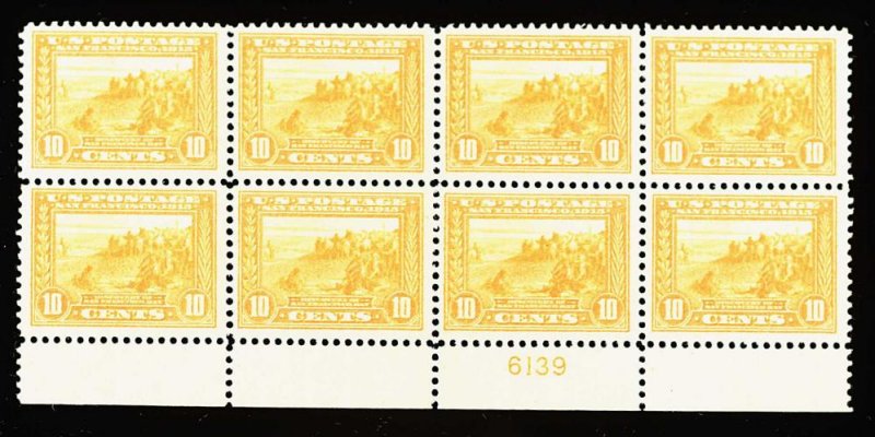 475 nhX 400 image#400, 10c Panama-Pacific, orange yellow, a gorgeous bottom margin plate no. 6139 block of eight, in the most pristine state of preservation possible, boasting absolutely radiant color and a deeply etched impression on bright crisp paper, remarkably well centered throughout, immaculate o.g., never hinged, a very fine and especially choice example of this rare commemorative plate block. (Image) 3,920.00+