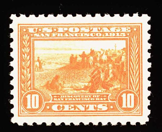 486 nh 404 image#404, 10c Panama-Pacific, perf. 10, a gem mint example of this scarce and popular commemorative, in the finest attainable quality, possessing mathematically precise centering amid extravagantly large margins which are most uncharacteristic, even its color is more intense and radiant than usual, immaculately white paper contrasts well with its strong impression, full and even perforations all around, pristine o.g., n.h., extremely fine; a truly rare stamp in this outstanding quality; 1980 PF certificate. (Image) 1,500.00