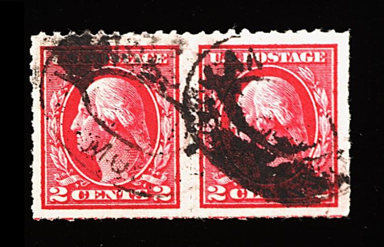 491 O 409 var. image#409 var., 2c Carmine, with "Kansas City" roulettes, used horizontal pair, with the same cancel that is found on the very few other certified used examples, very fine; genuine used examples of this are actually quite rare; 2000 PF certificate. (Image) Est. 150-200