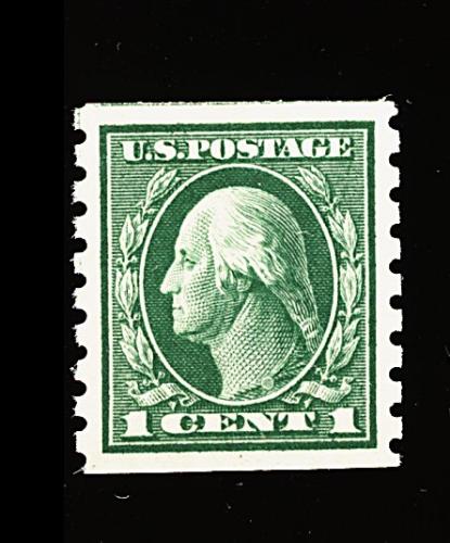 493 nh 412 image#412, 1c Green coil, perf. 8 1/2 vert., flawlessly centered amid extravagantly large margins, prooflike color and impression, immaculate o.g., n.h., extremely fine; a perfect coil single. (Image) 42.50