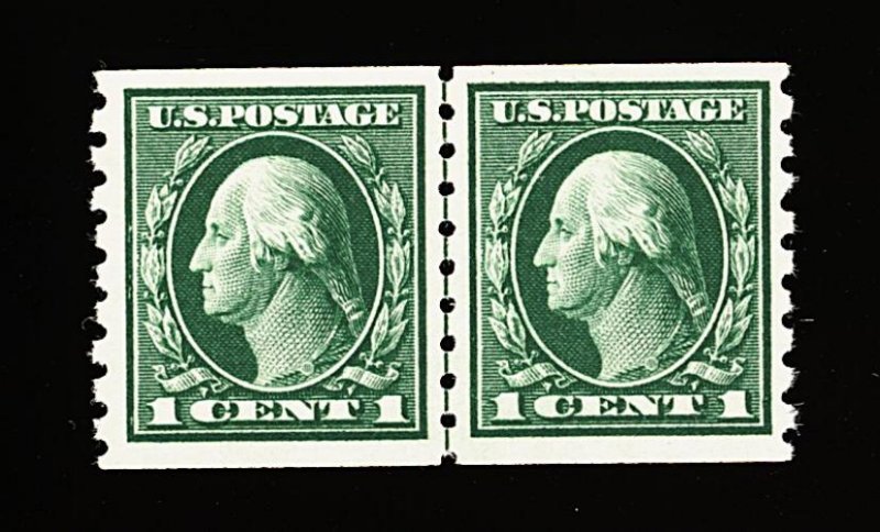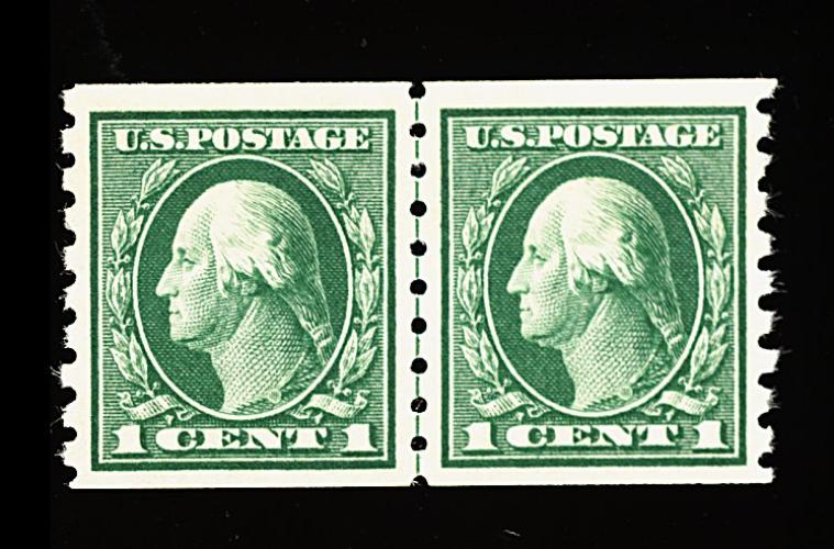 495 nh 412 image#412, 1c Green coil, perf. 8 1/2 vert., guide line pair, gorgeous prooflike color and impression on bright white paper, wonderfully well centered, o.g., n.h., extremely fine; a choice line pair; 2000 PF certificate. (Image) 200.00