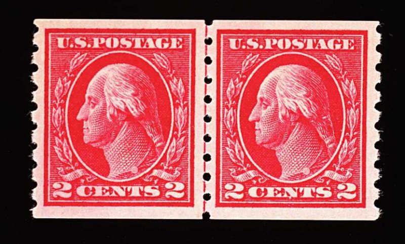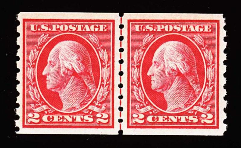 497 nh 413 image#413, 2c Carmine coil, Ty. I, perf. 8 1/2 vert., a gem guide line pair of this scarce and difficult coil, featuring virtually perfect centering amid very large margins, even its guide line is perfectly placed between the two stamps, eye-arresting color and impression on bright crisp paper, uniformly intact and even perforations which is uncommon on the perf. 8 1/2 coils, immaculate o.g., n.h., extremely fine; 1999 PF certificate. (Image) 400.00