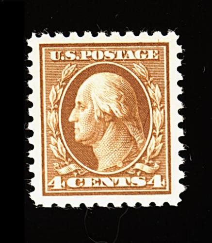 525 nh 427 image#427, 4c Brown, mathematically precise centering within wide margins, luxuriously rich color and impression, unusually even and intact perforations for a perf. 10 stamp, o.g., n.h., extremely fine and quite choice. (Image) 57.50