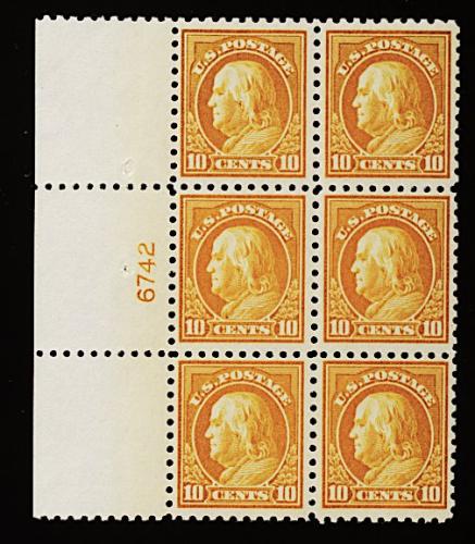 536 nhX 433 image#433, 10c Orange yellow, choice full left margin plate no. 6742 block of six, especially deep luxuriant color, well centered, crisp and intact, o.g., n.h., very fine. (Image) 1,200.00