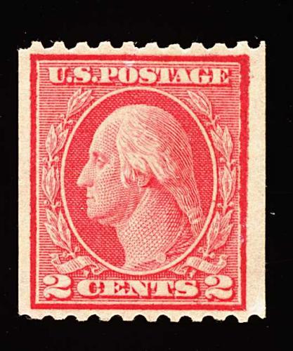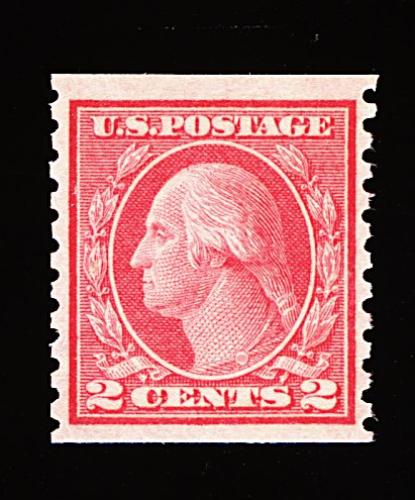 561 nh 449 image#449, 2c Red rotary coil, Ty. I, perf. 10 horiz., an exciting mint example of this notoriously difficult and very rare coil, being in a condition that is almost impossible to find, as this stamp possesses a wonderful overall mint "bloom", with strikingly rich red color distinctive only to genuine examples, its impression is well incised on bright paper, marvelously well centered as well, with uncharacteristically large margins all around, unblemished o.g., never hinged, extremely fine; one of the few certified never hinged #449 coil singles in existence; 1996 PF certificate. (Image) 3,800.00