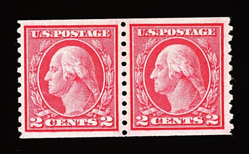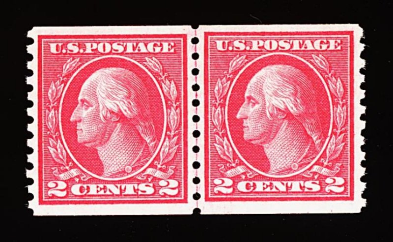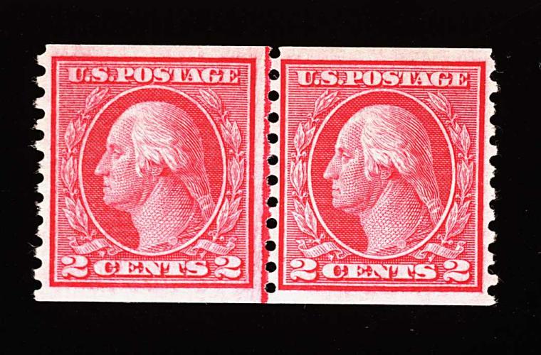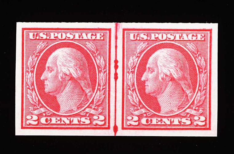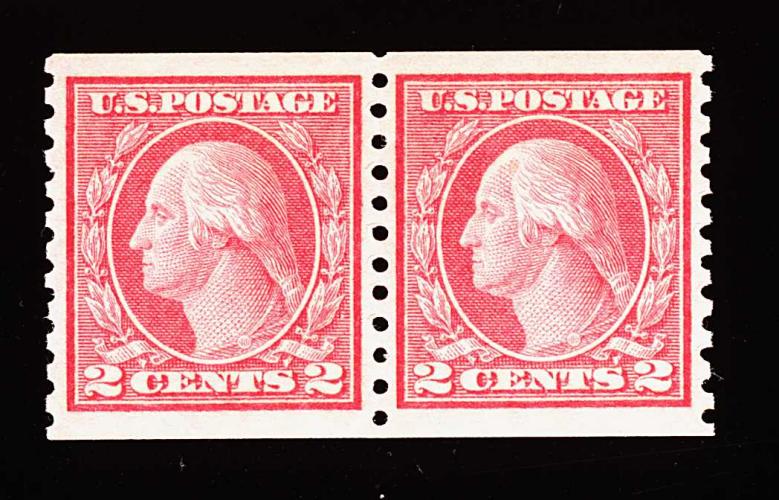 579 nh 459 image#459, 2c Carmine imperforate coil, joint line pair, four large and perfectly balanced margins, brilliantly fresh and crisp, usual mild crease in left stamp, o.g., n.h., extremely fine; 1997 PF certificate. (Image) 1,500.00