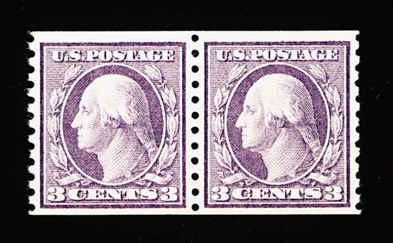 572 nh 456 image#456, 3c Violet rotary coil, Ty. I, perf. 10 vert., an extraordinarily choice mint pair, possessing a marvelous overall freshness and brilliance few other pairs enjoy, with considerably stronger color and impression than usually found on immaculate paper, exceedingly well centered within large margins, pristine o.g., n.h., extremely fine; a gem example of this scarce coil pair; 1975 and 1996 PF certificates. (Image) 900.00
