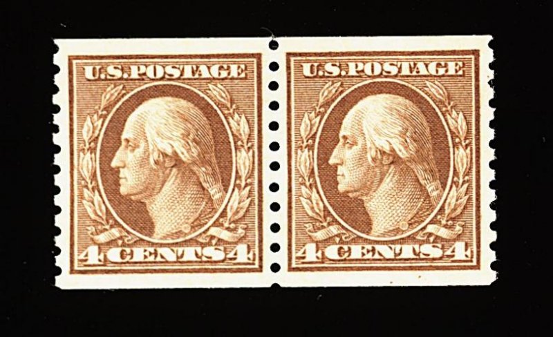 573 nh 457 image#457, 4c Brown rotary coil, perf. 10 vert., a remarkably choice pair that is perfectly centered within incredibly large margins, plus its color is especially deep and rich, o.g., n.h., extremely fine; a gem coil pair for the perfectionist; 1998 PF certificate. (Image) 95.00