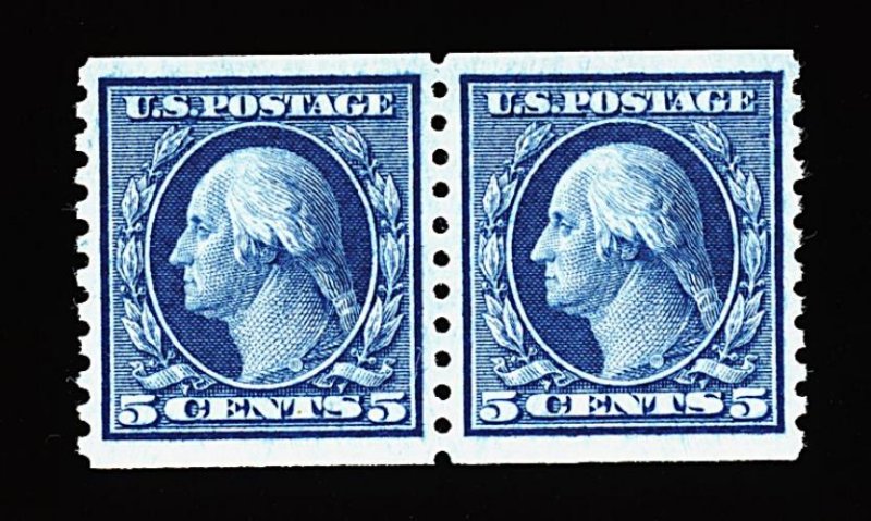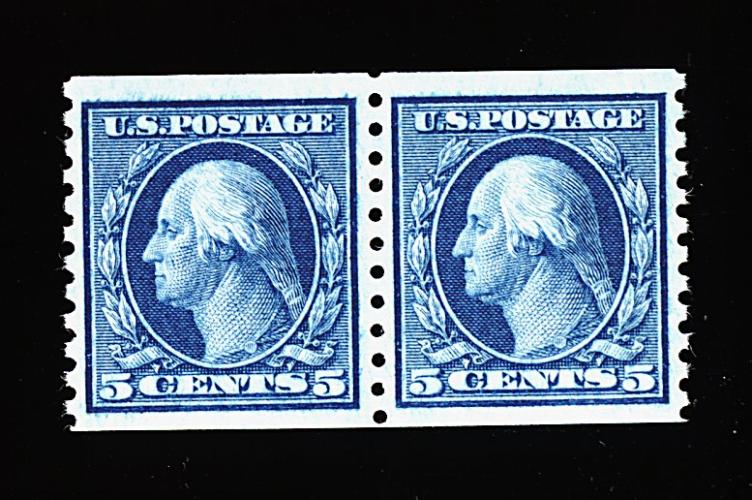 576 nh 458 image#458, 5c Blue rotary coil, perf. 10 vert., a choice quality joint line pair, impeccably well centered within large margins, especially rich luxuriant color, o.g., n.h., extremely fine; 2000 PF certificate. (Image) 290.00