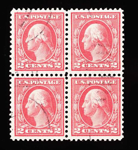 582 Obl 461 image#461, 2c Pale carmine red, a very scarce used block of four, bright color distinctive only to genuine examples of this often faked stamp, very light and unobtrusive cancels, nicely centered, fine-very fine; used singles of #461 are quite elusive, but used blocks of four are true 20th century rarities; 1999 PF certificate. (Image) 1,150.00