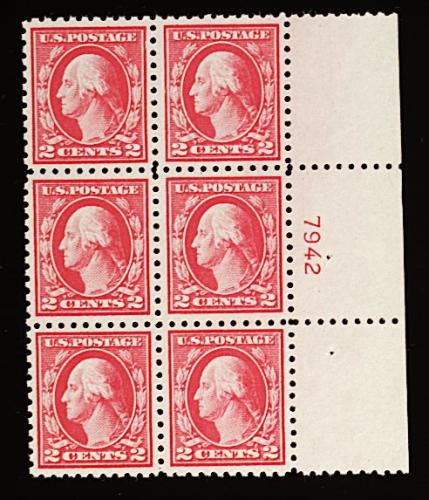 589 nhX 467 image#467, 5c Carmine error, full right margin plate no. 7942 block of six of the 2c value from the sheet which produced the 5c error, uncharacteristically well centered throughout, strong bright color, o.g., n.h., extremely fine overall. (Image) 225.00