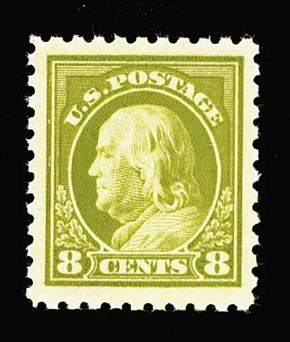 593 nh 470 image#470, 8c Olive green, an incredible jumbo-margined mint example, sporting the most gigantic margins imaginable for this value, and being extraordinarily well centered within them, eye-arresting color as well, even and intact perforations all around, pristine o.g., n.h., extremely fine; a most remarkable stamp; 1997 PF certificate for a plate block of six from which this stamp was taken. (Image) 92.50