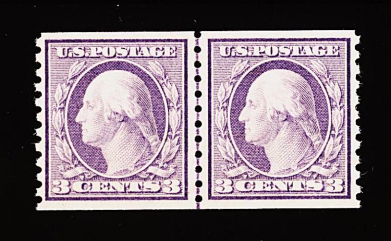 615 nh 493 image#493, 3c Violet coil, Ty. I, perf. 10 vert., choice joint line pair, exceedingly well centered, with far more intense color than usually associated with this stamp, brilliantly fresh, immaculate o.g., n.h., extremely fine; a surprisingly difficult line pair to find in premium quality; 1985 PF and 1999 PSE certificates. (Image) 175.00