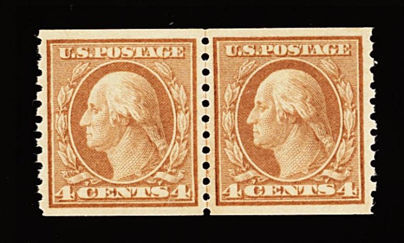 616 nh 495 image#495, 4c Orange brown coil, perf. 10 vert., brilliantly fresh joint line pair, bright color, perfectly centered amid extraordinarily large margins, o.g., n.h., extremely fine; not often seen this choice; 1999 PF certificate. (Image) 120.00
