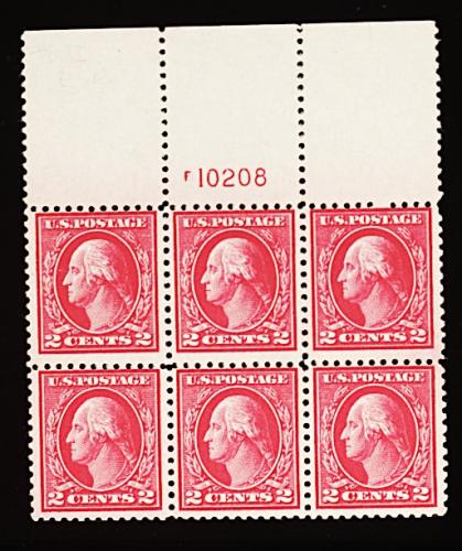 620 ogX 500 image#500, 2c Deep rose, Ty. Ia, full top margin plate no. F10208 block of six, with extra-wide sheet selvage, deep vibrant color, o.g., l.h., fine. (Image) 2,000.00