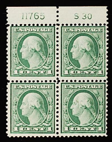 665 nhX 545 image#545, 1c Green coil waste, perf. 11, top margin plate no. 11765 block of four, with additional "S 30" in selvage, usual centering, fresh color, o.g., n.h., fine; a scarce plate block. (Image) 1,400.00