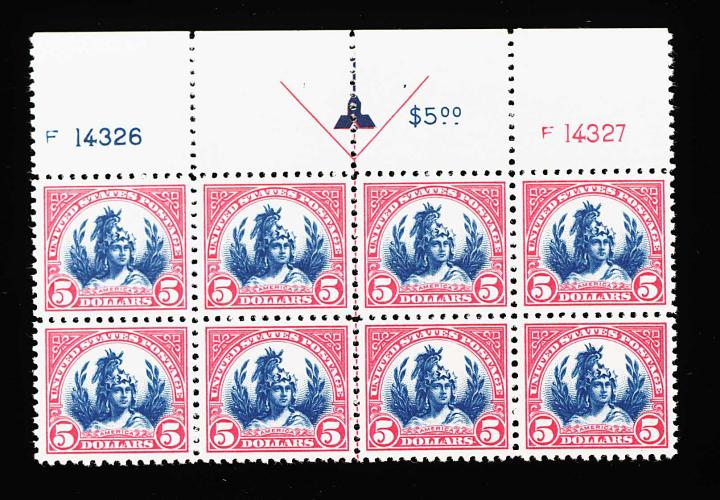 671 nhX 573 image#573, $5.00 Carmine and blue, an especially handsome and desirable full top margin arrow and plate nos. F14326, F14327 block of six, being incredibly fresh, with rich vibrant colors, each stamp is particularly well centered, o.g., never hinged, accompanying certificate mentions a tiny disturbed spot on one stamp which is infinitesimal and completely unworthy of mention, as this is one of the nicest examples of this popular plate block we have offered, extremely fine; 2000 PF certificate. (Image) 2,600.00