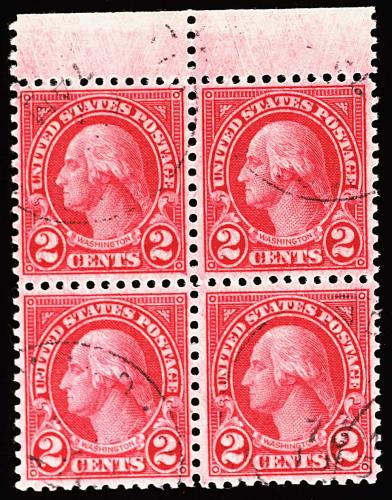 679 Obl 595 image#595, 2c Carmine coil waste, an exceedingly scarce and choice top sheet-margin used block of four, unusually well centered for this difficult coil waste issue, strikingly intense color, very light and unobtrusive pmks., very fine; one of the few used blocks of this we have ever encountered and certainly in the finest condition; 1999 PF certificate. (Image) 1,300.00
