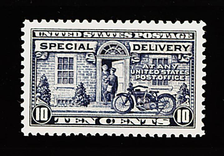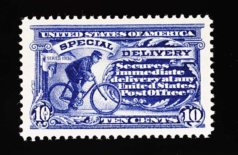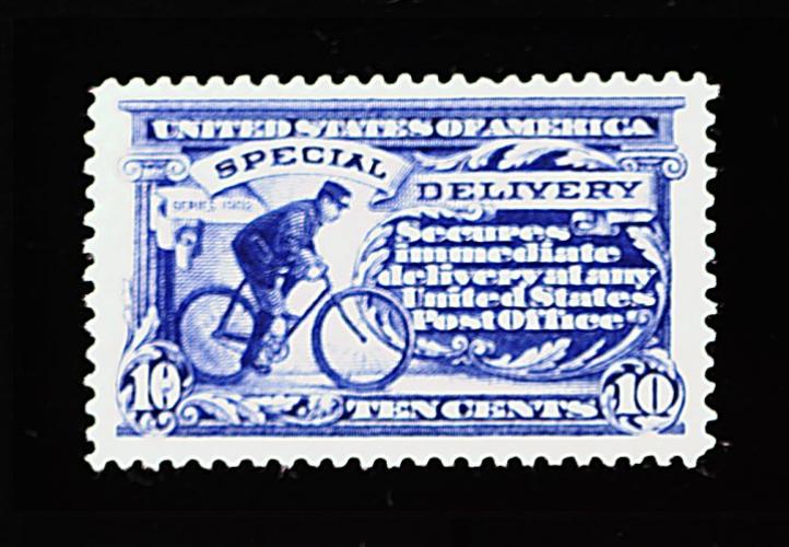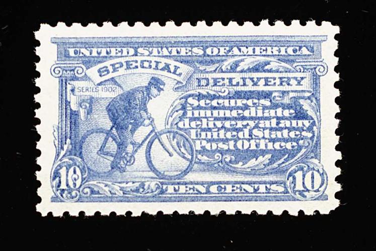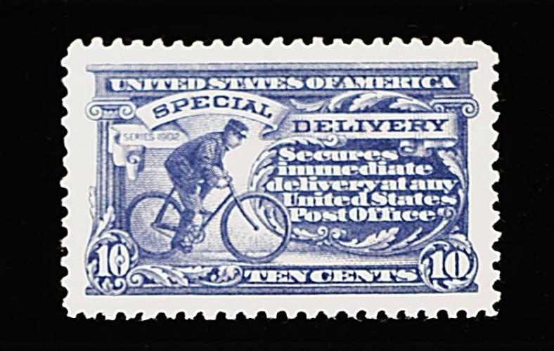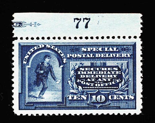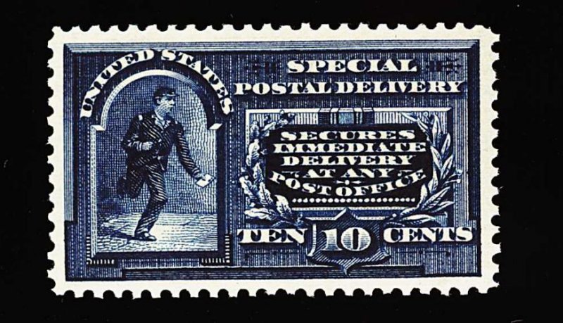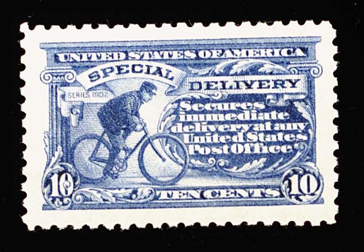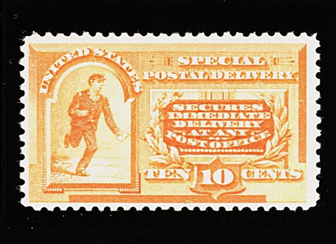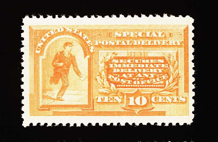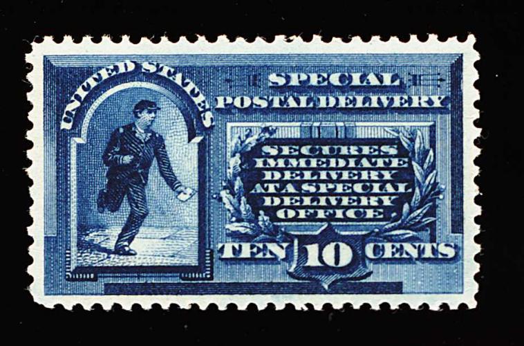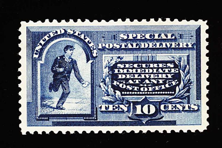 722 nh E2 image#E2, 10c Blue, the mint example offered here is one of the finest quality mint 1888 Special Deliveries in existence, as this remarkable stamp possesses physical attributes that are almost impossible to find on the early Special Delivery issues, including being fabulously fresh and bright, with truly prooflike color and impression on immaculate paper (not toned as so often found), incredibly well centered as well, with lavishly large margins all around, pristine o.g. that is completely devoid of any gum bends or skips, never hinged, an extremely fine gem for the finest collection; 1986 and 1996 PF certificates. (Image) 475.00