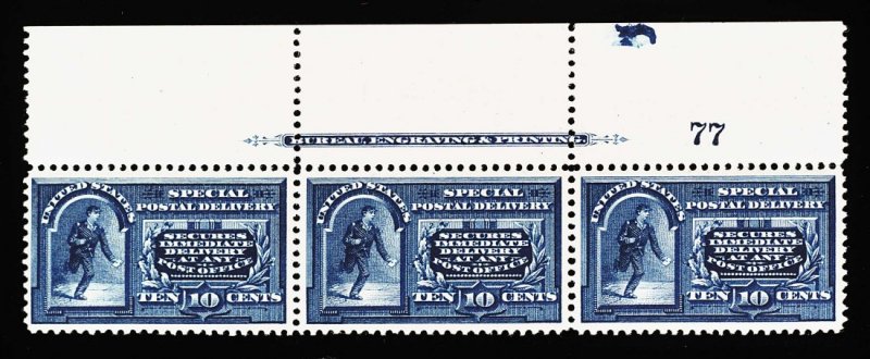728 nh E5 image#E5, 10c Blue, full top margin imprint and plate no. 77 strip of three, featuring intensely rich color on bright clean paper, exceptionally well centered, particularly the two right stamps which are absolute gems, o.g., n.h., very fine-extremely fine; 1995 PF certificate. (Image) 1,050.00