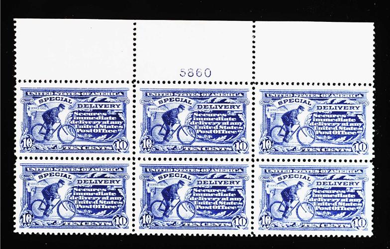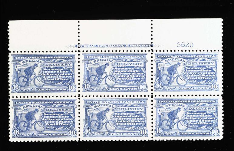 736 ogX E10 image#E10, 10c Pale ultramarine, full top margin imprint and plate no. 5520 block of six, an incredibly choice example of this very rare plate block, which is the even more elusive imprint and plate number position versus the plate number only, exceptionally bright and fresh, full intact perforations, well centered, o.g., stamps n.h., hinged only in the ungummed portion of the top selvage, extremely fine; one of the finest full top position #E10 plate blocks extant; illustrated in the Durland catalog; 1990 PF certificate; ex-Weisman. (Image) 5,500.00
