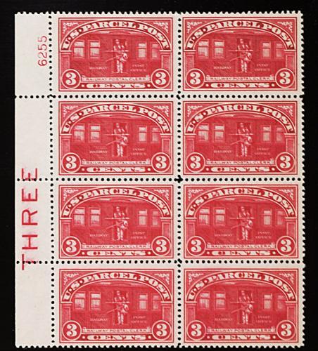 782 nhX Q3 image#Q3, 3c Parcel Post, scarce left sheet-margin "THREE" imprint and plate no. 6255 block of eight, striking intensely rich color, wonderfully well centered, o.g., n.h., lightly folded along center horizontal row of perfs., very fine and choice. (Image) 425.00