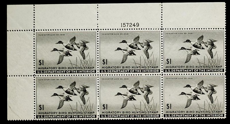 869 nhX RW15 image#RW15, 1948 $1.00 Blue, full bottom right margin plate no. 160100 block of six, very well centered, bright color, o.g., n.h., very fine. (Image) 325.00