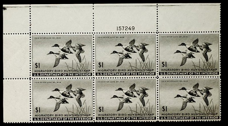 866 nhX RW12 image#RW12, 1945 $1.00 Black, full top left margin plate no. 157249 block of six, choice centering, fresh color, o.g., n.h., extremely fine. (Image) 400.00