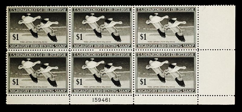 868 nhX RW14 image#RW14, 1947 $1.00 Black, bottom right margin plate no. 159461 block of six, unusually well centered, rich color, o.g., n.h., an extremely fine plate block. (Image) 290.00