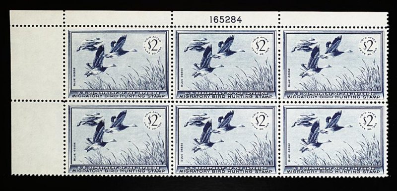870 nhX RW22 image#RW22, 1955 $2.00 Dark blue, top left margin plate 165284 block of six, excellent centering, fresh color, o.g., n.h., choice very fine. (Image) 475.00