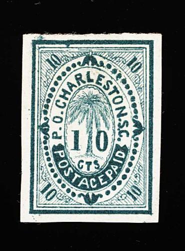 874 E E-12 imageDietz #E-12, Charleston, S.C., 10c Blue green essay on wove, large margins all around, fresh bright color, a couple minor thin spots, very fine appearance; a very scarce essay showing the palmetto tree that was used for the 1862 10c provisional entire (#16XU7); 1988 PF certificate; ex-Krieger. (Image) Est. 750-1,000
