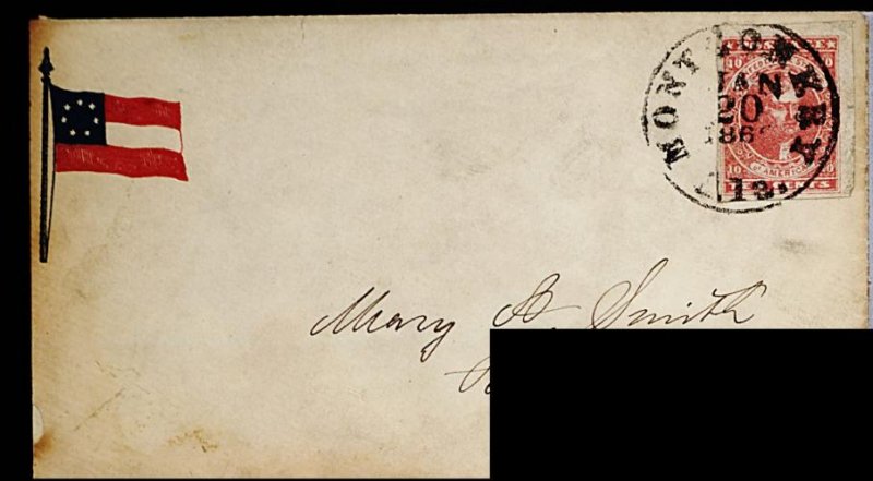 875 c 5 image#5, 10c Rose, four ample to huge margins, tied to very scarce seven star Confederate Flag patriotic cover (unlisted type in Dietz), bold "Montgomery, Ala./Jan 20/186(?)" c.d.s., addressed to Perrys Mills, Georgia, cover with edge toning most prominent on reverse, fine. (Image) 3,000.00