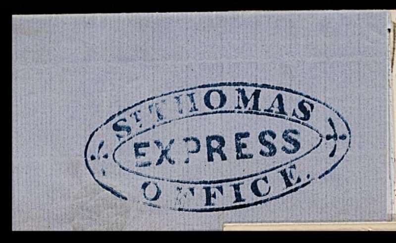 879 c imageSt. Thomas/Express/Office, large oval handstamp in blue green, a choice strike of this very scarce marking on the reverse of an 1866 folded letter addressed to Carupano (Venezuela), ms. "per Cognetta", very fine; this office was the successor to the Foreign Letter Office; 1993 PF certificate; ex-Plass. (Image) Est. 500-750
