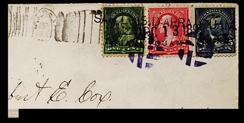 880 c 1,2,5 image#1, 2, 5, 1c, 2c and 5c Overprints, tied by violet straightline "San Luis D'Apra, Guam/Dec 13 1899" postmarks and matching cork cancels on cover to Pennsylvania, Manila Military Station backstamp, very fine. (Image) Est. 300-400