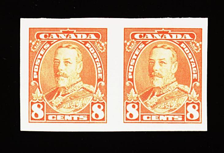 945 nh 217c/222a image#217c-218c, 220a-222A, 1935 1c-2c, 4c-8c King George V imperforate, horizontal pairs, large margins all around, brilliantly fresh colors, o.g., n.h., very fine (Unitrade C$1,250.00). (Image) 750.00