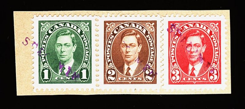 946 S 231-33S image#231S-233S, 1937 1c-3c King George VI, with violet "Specimen" handstamps, tied to a piece, overprinted by the receiving postal administration, very fine; a most unusual item for the specialist; 1977 BPA certificate. (Image) Est. 150-200