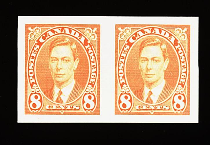 947 nh 231c-236a image231c-236a, 1937 1c-8c King George VI, imperforate, horizontal pairs, each with large even margins all around, bright fresh colors, o.g., n.h., 2c with trivial gum bend, 3c with tiny inclusion spot, still a very fine set; only 100 pairs of each exist (Unitrade C$2,700.00). (Image) 1,350.00