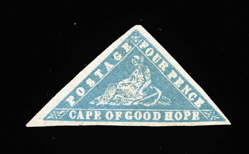 953 ng 9 image#9, 1861 1p Pale milky blue "Woodblock", a magnificent unused example of this classic rarity, being one of the very few sound examples in existence, but even more remarkable is the overall quality of this gorgeous stamp, featuring lavishly large margins all around, strong rich color and impression on bright fresh paper, without gum as is always the case, extremely fine; the rarity of this stamp in such outstanding condition cannot be overstated, as none of the great Cape collections sold in the past twenty years (Sir Maxwell Joseph, Dale-Lichtenstein, "Salisbury", Indhuspohon) had a sound unused example of the 1p "Woodblock"; a stamp for the finest collection of mint British Empire or for a world-class exhibit of Cape triangles; 2000 BPA certificate (S.G. #14b; £11,000). (Image) 11,000.00+
