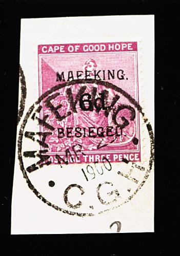 954 O 165 image#165, 1900 6p Mafeking surcharge on 3p Red violet, fresh example tied to piece by choice "Mafeking/Mr 29 1900/C.G.H." c.d.s., fine and scarce (S.G. #4; £250). (Image) 275.00