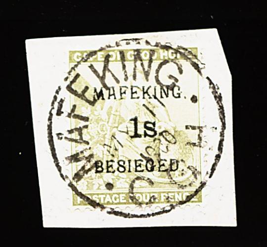 955 O 166 image#166, 1900 1/- Mafeking surcharge on 4p Pale olive green, pos. 2, well centered example, tied to small piece by socked-on-the-nose "Mafeking/My 11 1900/C.G.H." c.d.s., very fine; 1986 PF certificate; ex-Asch (S.G. #5; £325). (Image) 325.00