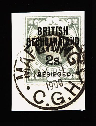 958 O 177 image#177, 1900 2/- Mafeking surcharge on 1/- Green, nicely centered example tied to piece by neat "Mafeking/My 1 1900/C.G.H." c.d.s., very fine and scarce (S.G. #16; £325). (Image) 325.00