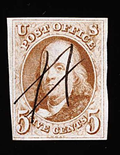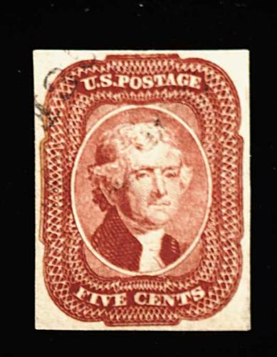 81 O 1 image#1, 5c Red brown, large margins all around except just touching the frame line at bottom left, fresh color and a fine impression, ms. cancel, very fine; photocopy of a 1979 PF certificate. (Image) 300.00